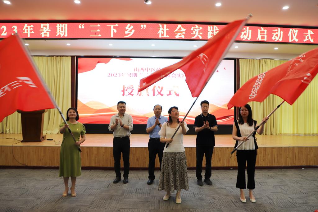 吴鹏、乔哲瑞、苗强分别为山西中医药大学、山西药科职业学院、山西卫生健康职业学院三支社会实践代表队伍授旗。
