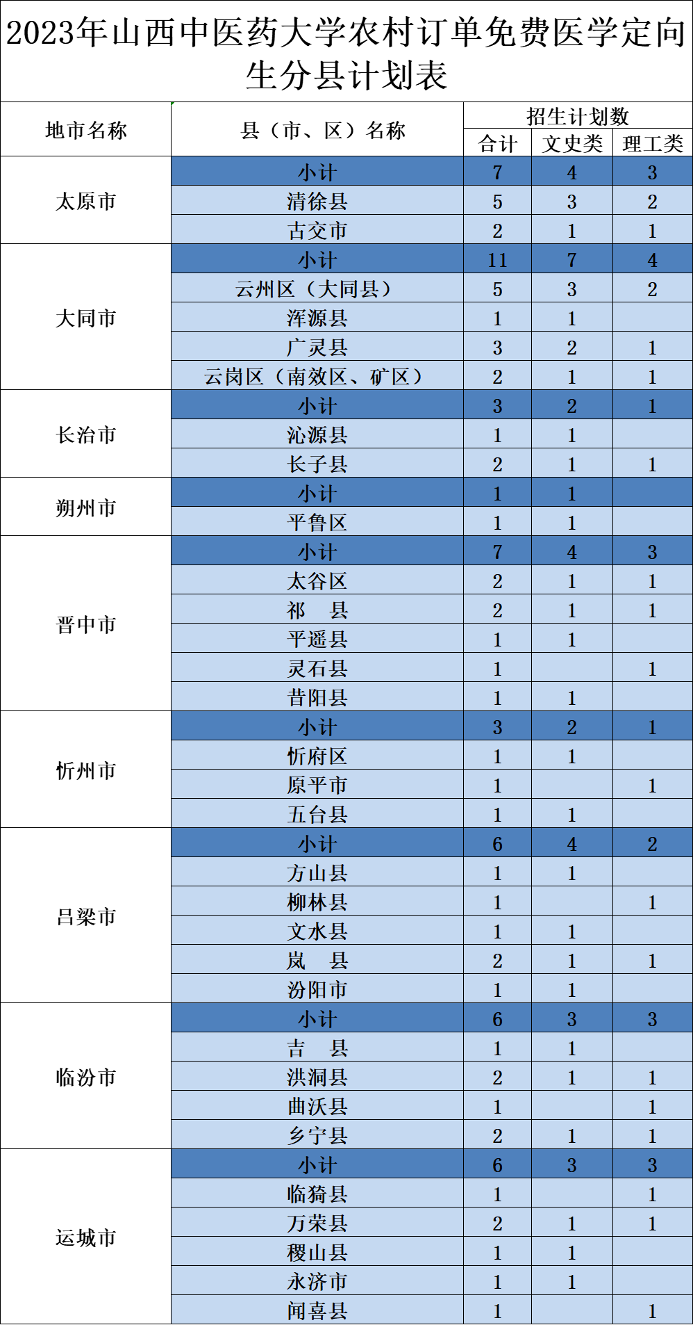 2023年山西中医药大学农村订单免费医学定向生分县计划表