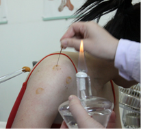 点留刺火针在酒精灯上烧至通红后,轻点人体表皮,待针冷后,提离人体。尖头、平头、三头和火鍉针可用此刺法,较浅疾刺温经作用更强。