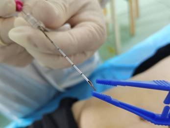 (2)操作方法:患者取合适体位,暴露所需埋线部位,常规皮肤消毒。镊取一段羊肠线或者其他可吸收线体,置于埋线针针管的前端,用镊子将线体推入针管。据进针部位不同,左手拇、食指绷紧或提起进针部位皮肤,右手持针,迅速刺入皮下,并根据穴位解剖特点,进一步伸入到穴位适宜深度。在获得针感后,边推针芯,边退针管,将线体植入穴位的皮下组织或肌层内。出针后压迫针孔片刻。