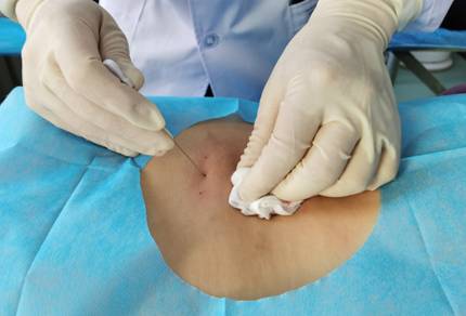 (1)针具:小针刀是由于金属材料做成的,似针又似刀的一种针灸工具,是在古代九针中的镵针、锋针等基础上,结合现代医学外科用手术刀而发展形成的。针刀有14种类型39种型号,目前临床常用的针刀道具的刀柄为扁平葫芦状,刀身由不锈钢制成,直径0.4-1.2mm,长30-100mm,小针刀刀身为圆柱形,刀头为楔形,末端扁平带刃,刀口线宽度为0. 8cm,刀口为齐平口,刀口线和刀柄在同一平面内。