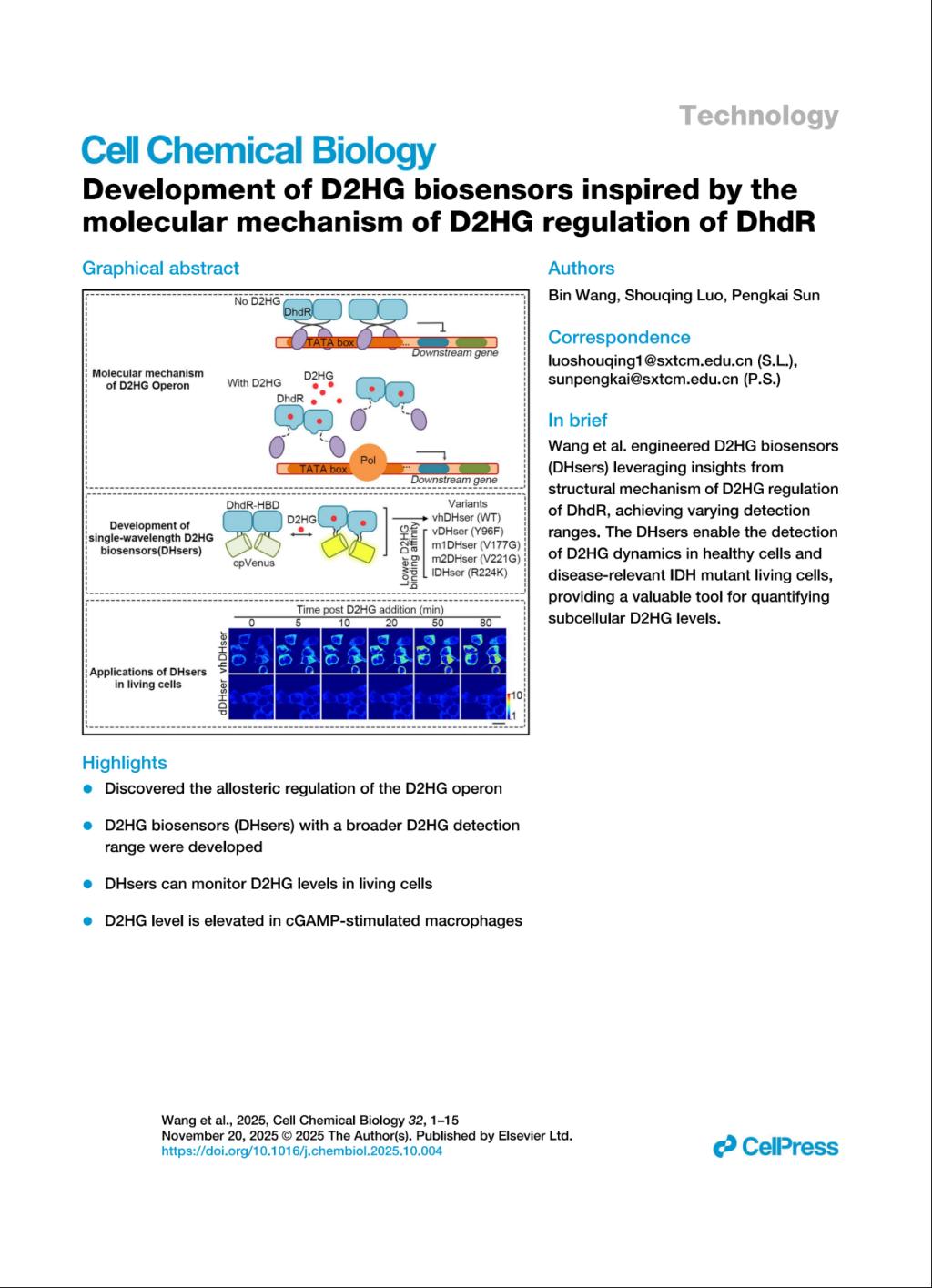 11月6日,我校孙鹏凯课题组联合罗寿青课题组在《Cell Chemical Biology》期刊发表了题目为:“Development of D2HG biosensors inspired by the molecular mechanism of D2HG regulation of DhdR”的学术论文。该研究揭示了一种D型羟基戊二酸(D2HG)操纵子模型的分子机制,同时基于此分子机制开发了活细胞D2HG生物探针。