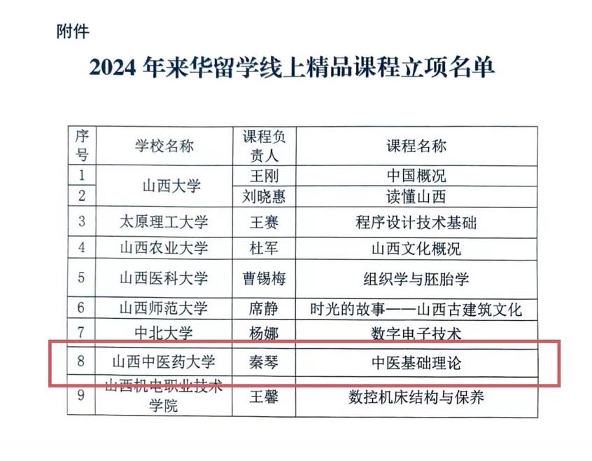 6月19日,山西省教育厅公布了2024年来华留学线上精品课程立项名单。我校秦琴老师负责的《中医基础理论》获得立项。