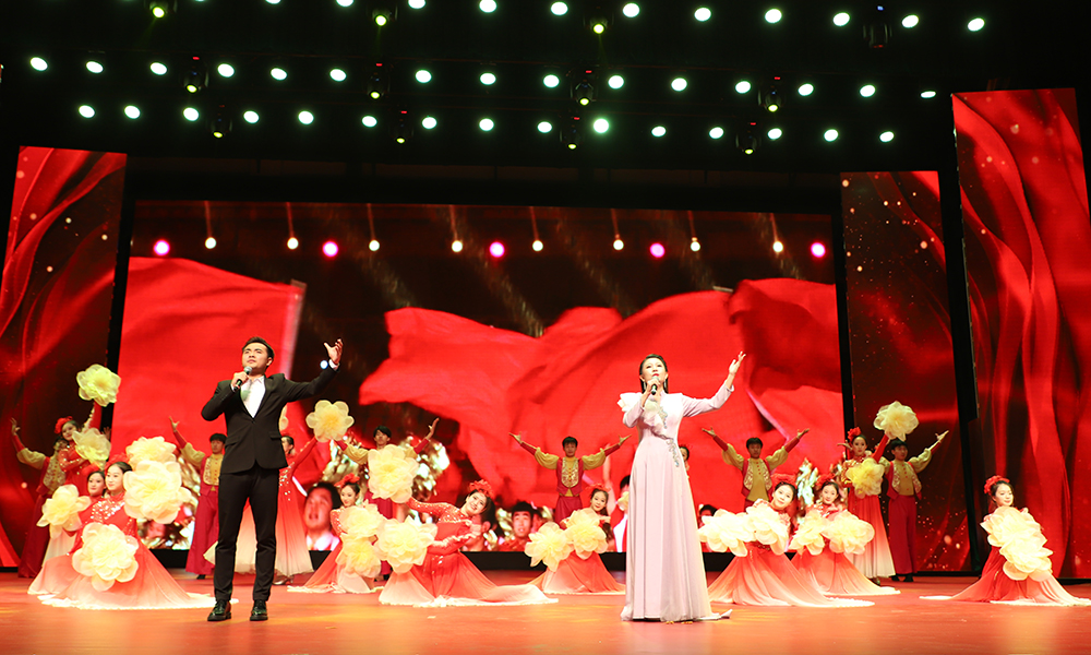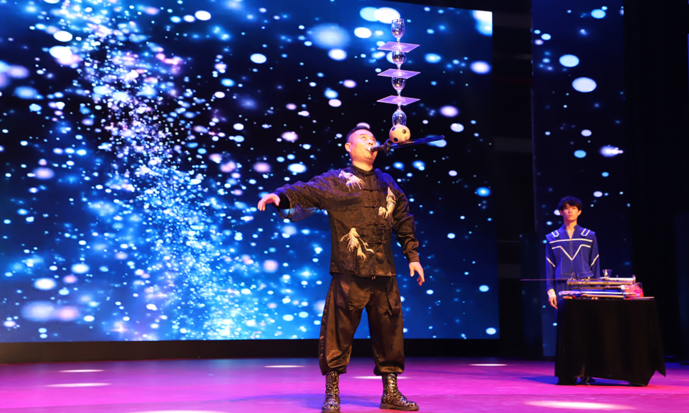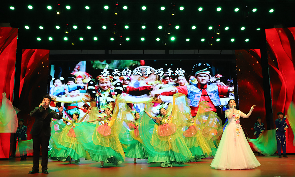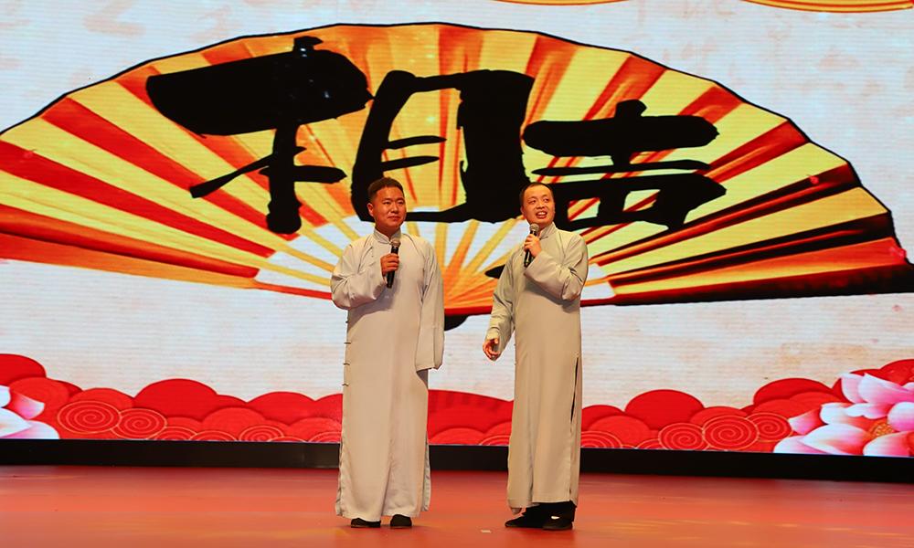 山西省曲艺团和山西华夏之根艺术团联袂为师生呈现了一场文化大宴。演出在气势磅礴的开场歌舞《春潮》中启幕,涵盖了音诗画朗诵、女声独唱、相声、情景表演唱、男女声二重唱、女子舞蹈、男声独唱、杂技、小品等多种艺术形式。整台节目内容丰富,编排紧凑,生动展现了新时代劳动者风采和永远跟党走的坚定信念。