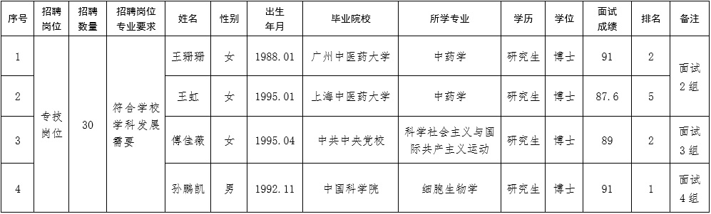 根据《山西中医药大学2024年公开招聘博士研究生实施方案》等相关规定,我校组织开展了博士研究生招聘工作。通过报名、资格审查、考核、体检、考察等环节和程序,经2024年7月11日校长办公会议党委会议研究同意拟聘用王珊珊等4名博士研究生,现予以公示。