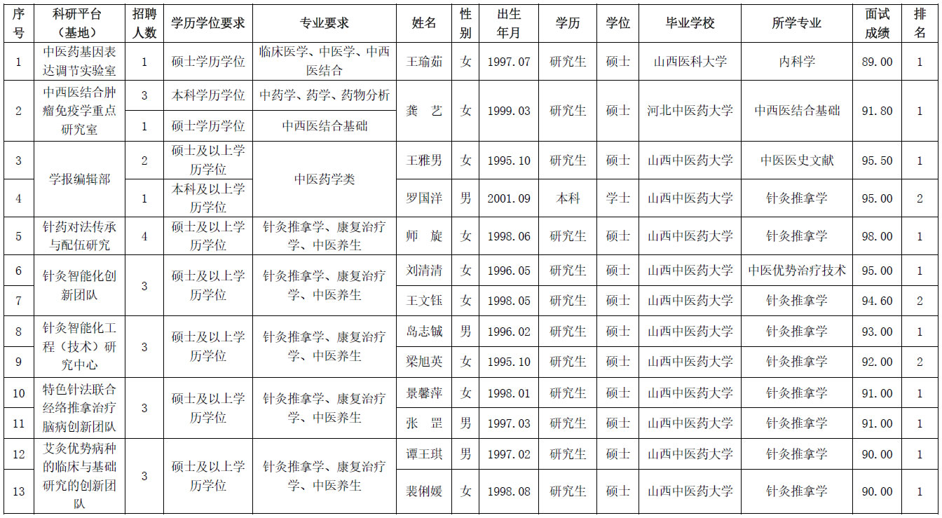 山西中医药大学2024年公开招聘科研(行政)助理第一批拟聘用人员公示
