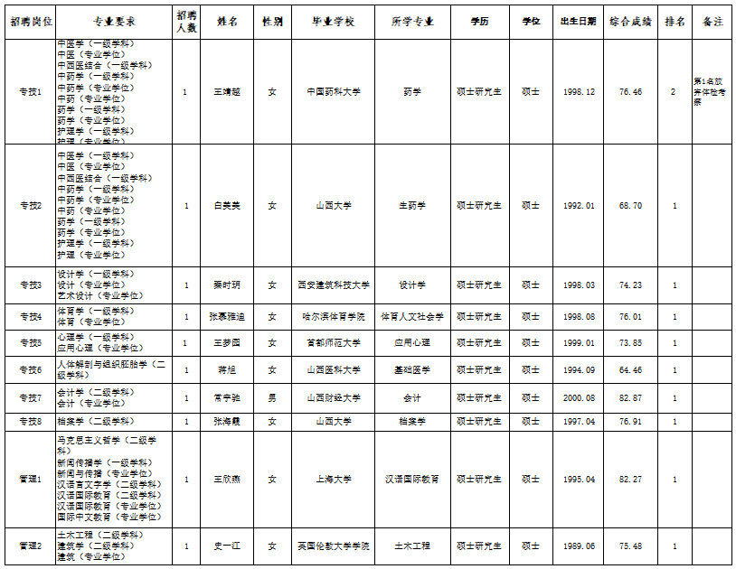 根据《山西中医药大学2025年公开招聘工作人员实施方案》等相关招聘规定,通过报名、资格初审、笔试、资格复审、面试、体检、考察等招聘环节和程序,经2025年7月18日校长办公会议和党委会议研究,同意聘用王靖越等10名硕士研究生,现予以公示。