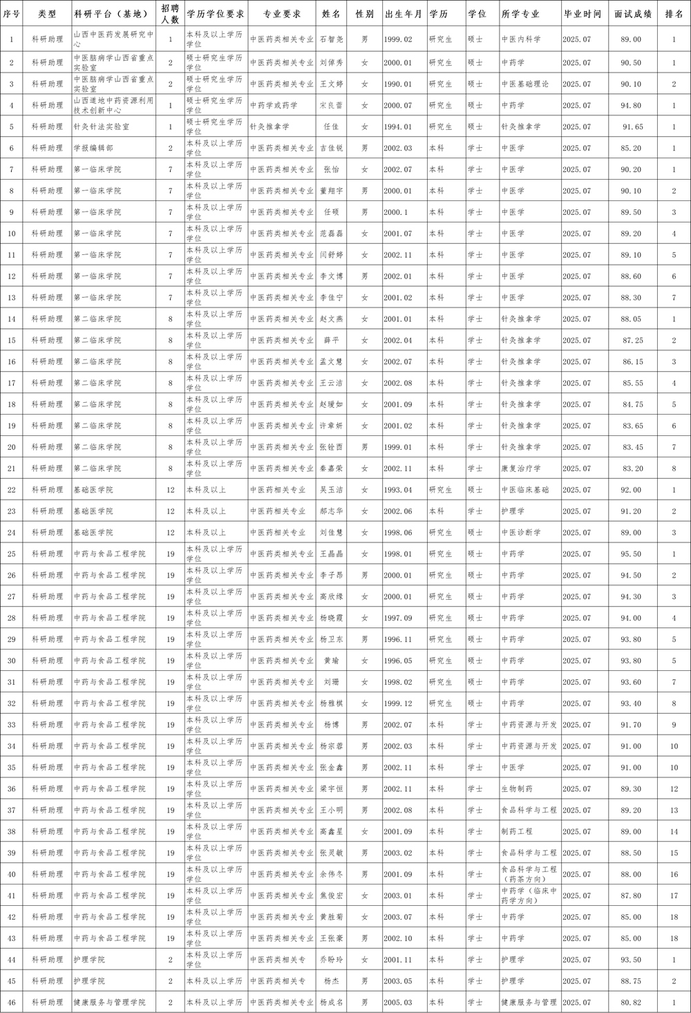 1.山西中医药大学2025年公开招聘科研助理(第一批)拟聘用人员名单