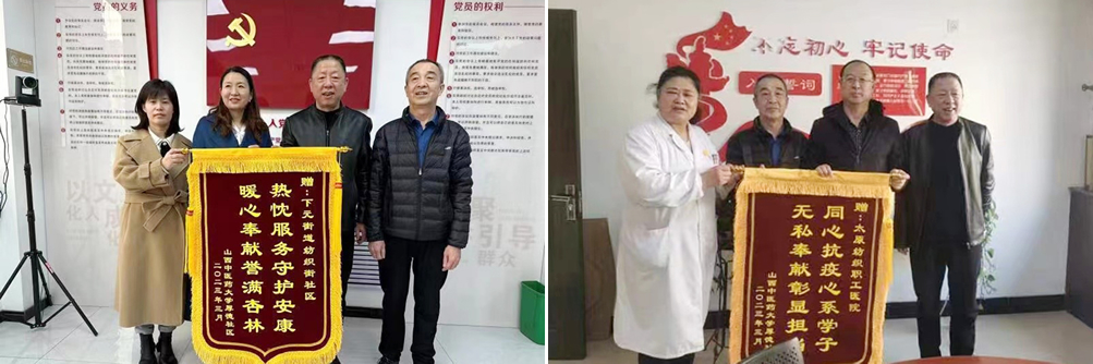 2月28日,厚德社区管委会主任王格红、党支部书记张东坡带领厚德社区工作人员前往下元街道纺织社区、太原纺织职工医院,为他们在疫情期间对我校厚德社区学子做出的贡献与帮助表示衷心的感谢,并赠送锦旗表达敬意。