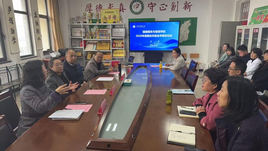 10月24日下午,健康服务与管理学院在知行书院408会议室召开2026年度国家自然科学基金项目申报启动会。山西医科大学公共卫生学院佟岩教授、学院党总支书记贾晓斌、院长宋丽娟出席,副院长田松主持,学院全体教师参加会议。
