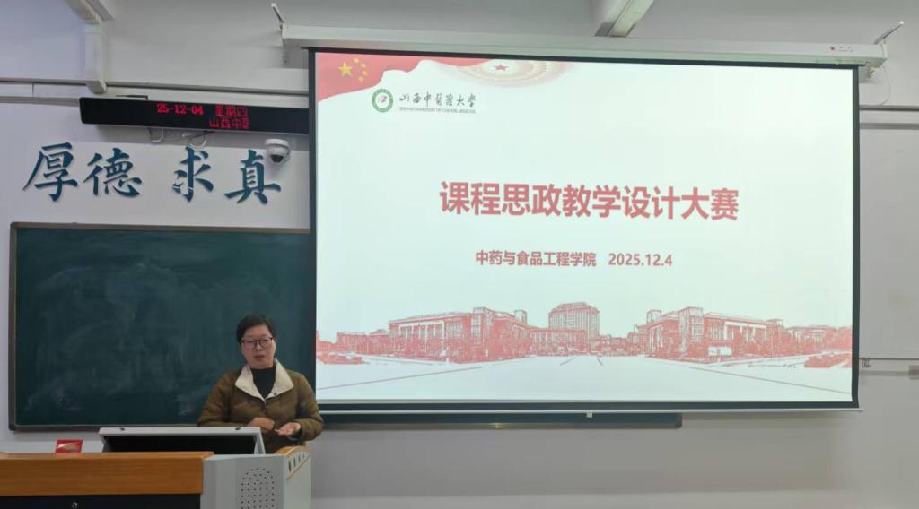 为推动课程思政与专业教学深度融合,提升教师课程思政教学设计与实施能力,12月4日下午,中药与食品工程学院在和剂书院甲座209举办了课程思政教学设计大赛。学院领导及教师代表参加活动。学院邀请马克思主义学院王萍、基础医学院韩诚、校督导委员王瑞和裴香萍老师担任评委。