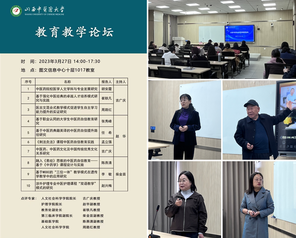 3月27日下午,教务处利用教研“周一时间”举办2023年第二期“教育教学论坛”,教学改革创新项目及中医药自信专项负责人依托于项目结题开展了成果汇报与交流。论坛邀请人文社会科学学院院长吉广庆、护理学院院长赵华、教务处副处长崔轶凡、第三临床学院副院长柴金苗、人文社会科学学院周路红、基础医学院陈燕清作为点评专家。各教学单位教学院长、教研室主任、教学秘书及教师等40余人参与本次论坛。