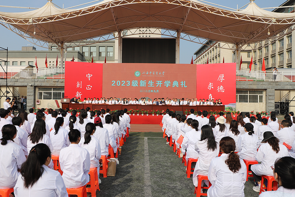 郝慧琴介绍了近年来学校在建设高水平中医药大学新征程中取得的成绩。围绕学校肩负着“教书育人”和“治病救人”两大神圣使命,她对全体新生提出三点殷切希望:一要心怀“国之大者”,把“国之大者”作为未来学习的不懈动力,主动承担历史责任,扎实学习医学知识,养成良好的学习习惯。二要秉承“大医精诚”,把“大医精诚”作为未来成长的价值追求,弘扬“敬佑生命、救死扶伤、甘于奉献、大爱无疆”的精神,全心全意为人民服务,“精”于专业,“诚”于品德,尽毕生之力践行“大医精诚”。三要“坚持不懈”,把学习作为一种生活方式,将困难当作磨炼心智的历练,将挫折作为通向成功的阶梯,将挑战变成奋勇前行的动力。