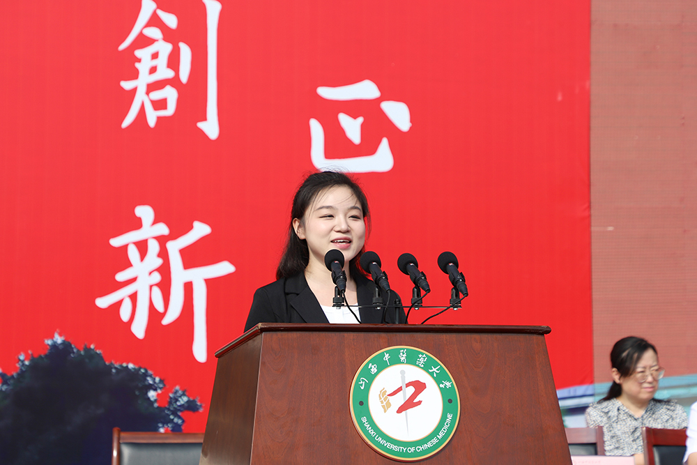 第二临床学院21级针推二班冯佳琦同学代表在校生发言。她希望学弟学妹们在美好的大学时光里,且学且悟且成长,且往且思且徐行,担负起传承中医药事业的光荣使命。