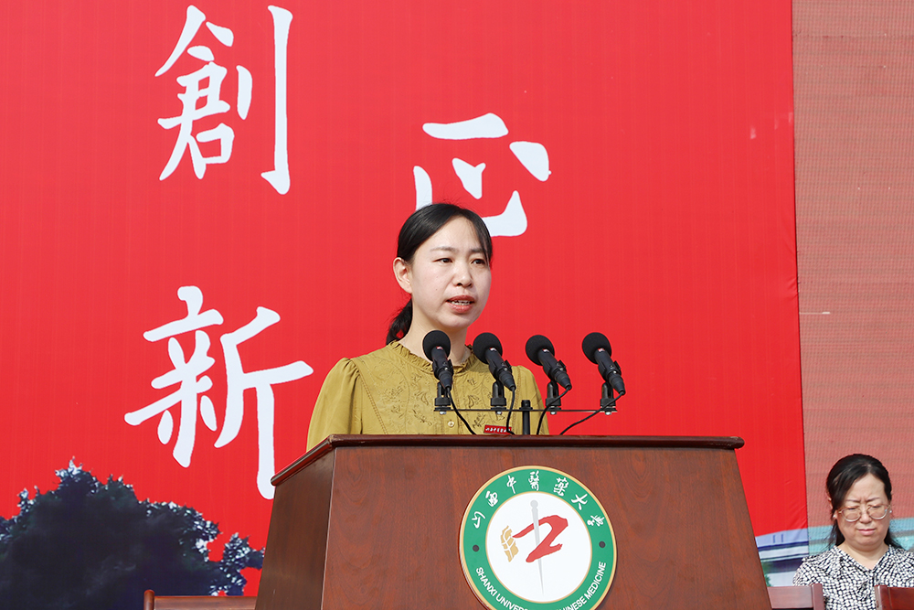 中药与食品工程学院裴科副教授代表教师发言。她希望同学们要有坚定的中医药自信,勇担时代的使命,锲而不舍,久久为功,探索中医药奥秘,传承中医药精华。