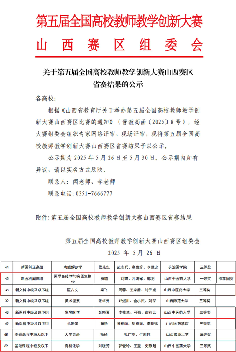 近日,由教育部高等教育司指导,山西省教育厅举办的第五届教师教学创新大赛山西赛区结果揭晓,基础医学院以贾璐为代表的《医学免疫学与病原生物学》课程团队在此次省赛中斩获新医科组副高组一等奖,并被推荐参加国赛,刷新了我校在教创赛中的历史最佳成绩。以刘晓芳为代表的《有机化学》课程团队、彭晓夏为代表的《生物化学》课程团队、梁飞为代表的《医古文》课程团队分别获得新医科组、新文科组中级及以下组三等奖。