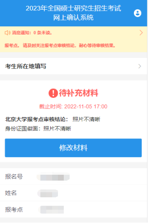 (二)待补充材料:未通过初次审核、须补充材料的考生,登录系统后可看到如下页面。考生须根据提示在规定时间内登陆系统,按照确认流程重新上传“未通过审核的图片材料”提交审核。逾期视为自动放弃报名资格。
