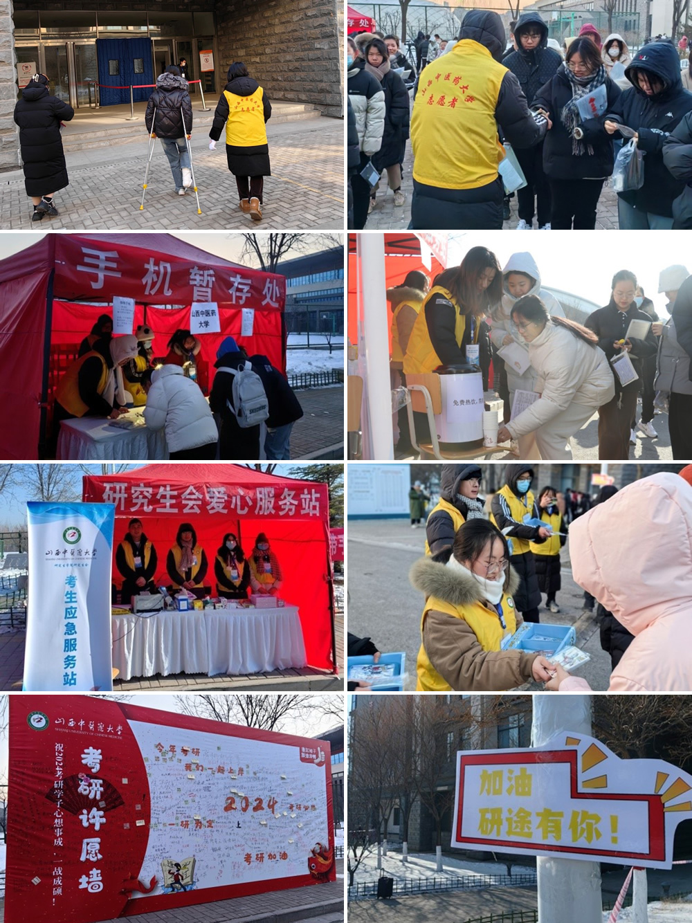 一个暖贴热了手,一杯热饮暖了心。面对史上最冷考研日,山西中医药大学研究生会志愿者给场外排队候考的考生免费发放了暖贴,给考生送去温暖。在考区外围设置了“研究生会爱心服务站”,用心将服务做到极致。研究生会还通过学校国医堂,调制了大量醒神酸梅汤热饮,免费供应给考生饮用。研究生会全面参与本次考点考生服务工作,多角度、多层次的开展暖心助考服务工作。设立了考研许愿墙,在考生必经的路上,沿途设置了系列提醒牌,给考生带来入场前的温馨提醒。研究生会爱心服务站为考生提供考研一站式全方位服务,免费为考生打印准考证,同时免费提供考试用品,甚至免费准备了女生卫生用品,用实实在在的举措为广大考生解难题、办实事,得到考生们的一致好评,将我校以服务为宗旨的理念进一步落实落地,暖心助力研考。