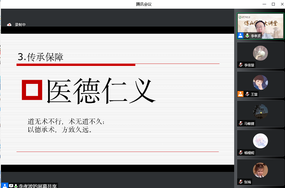 4月22日上午,研究生学院邀请山西中医药大学硕士生导师、国家级中医学术流派传承人李孝波老师为广大师生做了题为“经方实证与经典精神”的学术讲座。讲座采用腾讯会议线上直播的方式,研究生学院副院长赵琼主持会议,两百余名师生参加了本次讲座。
